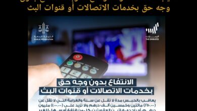 الانتفاع بدون وجه حق بخدمات الاتصالات أو قنوات البث، يعاقب بالحبس مدة لا تقل عن سنة والغرامة التي لا تقل…