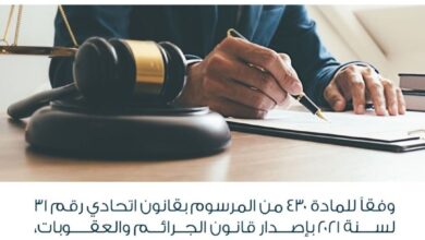 وفقا للمادة ٤٣٠ من المرسوم بقانون اتحادي رقم ٣١ لسنة ٢٠٢١ بإصدار قانون الجرائم والعقوبات. المصدر: النيابة العامة.